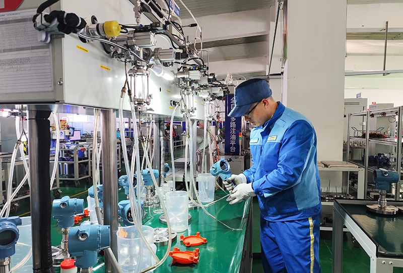 注油工序将“精打细算”发挥的淋漓尽致。硅油作为制作法兰变送器的必需品,在注油方式未改进前,每一台变送器注油量的多少,只能根据人为的经验去判断,没有确切的使用标准,这就造成了制作前对硅油进行加热处理的用量很难把控。制作完成后剩余硅油含有杂质,不能二次使用,长此以往,造成废旧硅油的堆积。为解决这一瓶颈,注油台增加抽滤瓶装置,对剩余硅油利用抽真空方式进行杂质过滤,废旧硅油得到了最大限度的利用。同时改进注油方式,根据毛细管的长度以及硅油密度计算出准确的注油量。3米、5米、8米……各类型毛细管法兰变送器的注油量得到了精准把控,经过改进后,原来每月20公斤硅油的使用量,降低到现在的10公斤,并且利用率至少提高了50%。
