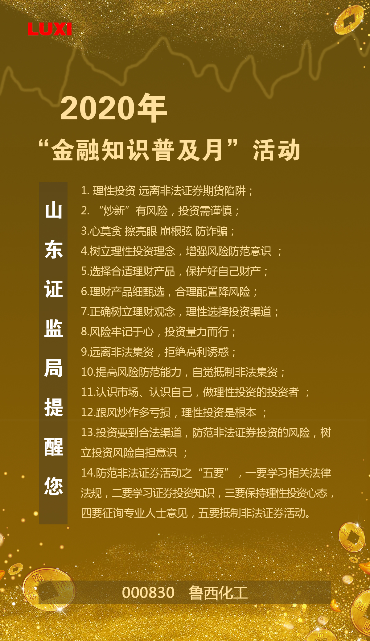 2020年“金融知识普及月”活动,山东证监局提醒您:1. 理性投资 远离非法证券期货陷阱; 2. “炒新”有风险,投资需谨慎; 3.心莫贪 擦亮眼 崩根弦 防诈骗; 4.树立理性投资理念,增强风险防范意识 ; 5.选择合适理财产品,保护好自己财产; 6.理财产品细甄选,合理配置