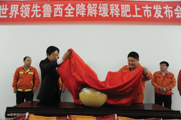 发布会上,柴田光慈先生首先发表了热情洋溢的祝贺词,祝贺鲁西缓释肥成功下线,祝贺鲁西把真正的控释缓释肥贡献给中国农民。随后,姜总和柴田光慈先生共同为全降解缓释肥揭开“面纱”,向现场展示全降解、精准释放、高效、国际领先的缓释颗粒肥。