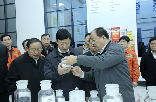 集团董事长张金成在产品展示中心重点向领导介绍了园区化工新材料产品的生产情况、制造与工程板块集研发设计、制造安装和运行管理与一体的优势以及园区的整体建设和未来规划情况。