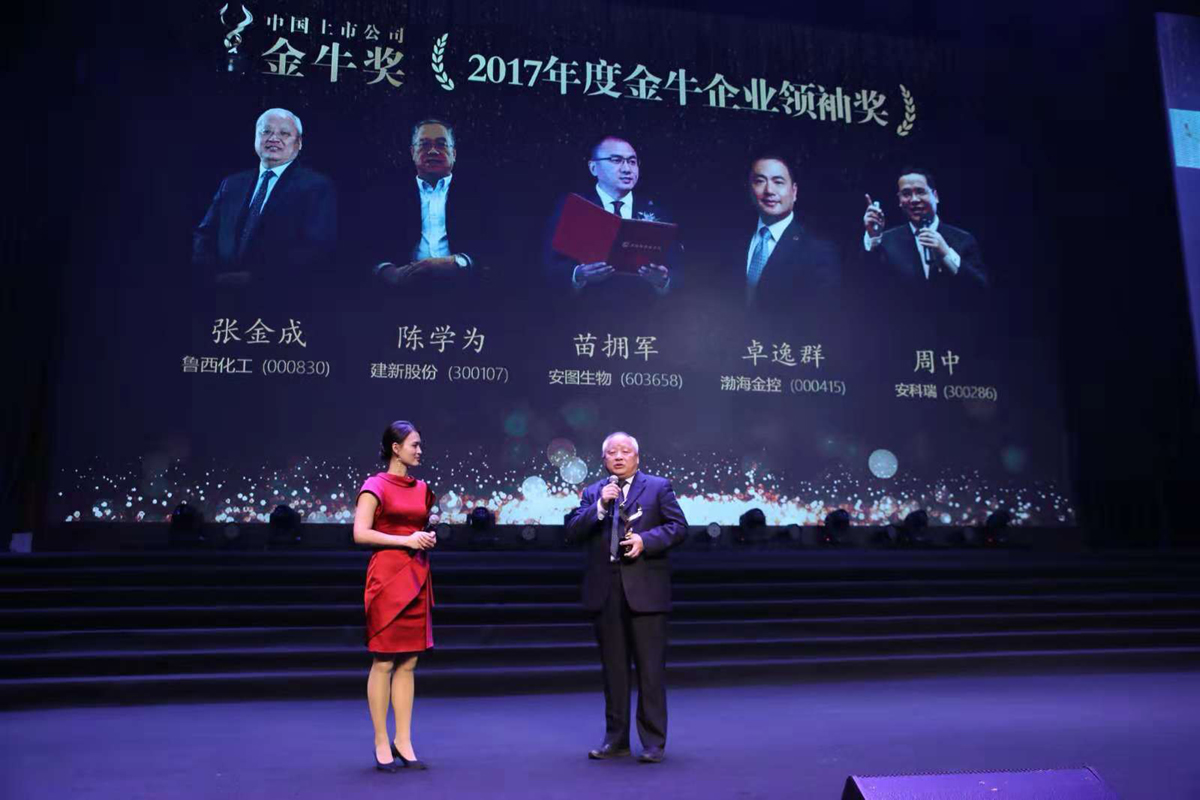 11月15日,由中国证券报主办的第二十届中国上市公司金牛奖颁奖盛典在四川成都举办。鲁西化工集团董事长张金成荣获“中国上市公司金牛企业领袖奖”,并作为代表做了规范、坚守和创新的获奖感言。