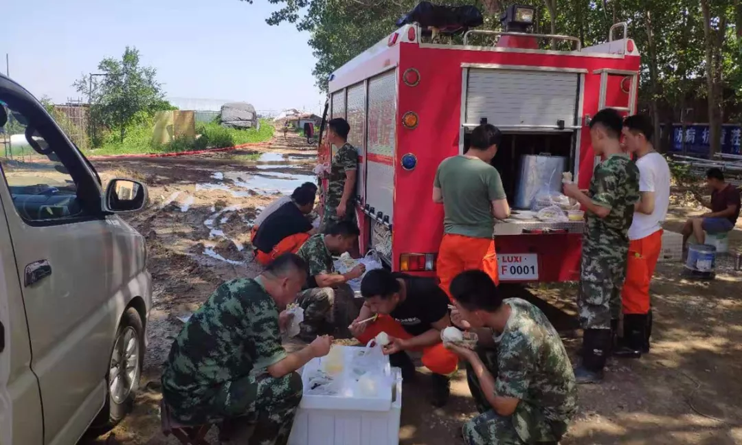 在现场,刘万兴队长正大声向救援队员们念着董事长发来的微信:你们为鲁西增光,要照顾好大家的生活,轮流休息好,向你们致敬!