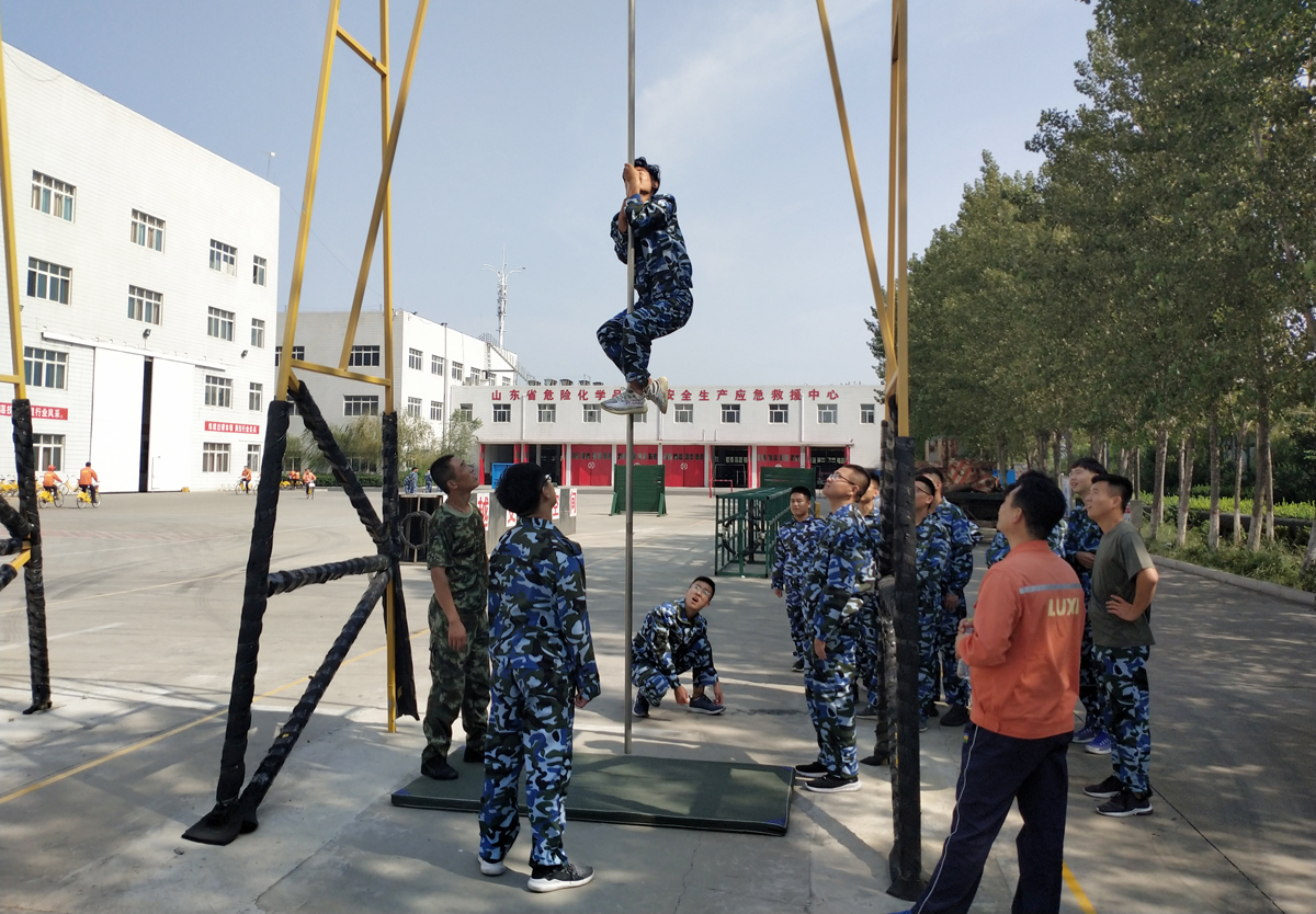 迎来了一批身穿蓝色迷彩服的小伙子,大家在不同的实训区域认真进行着救援体能训练、焊接、安全体验等,一招一式的动作都非常的认真和投入。
