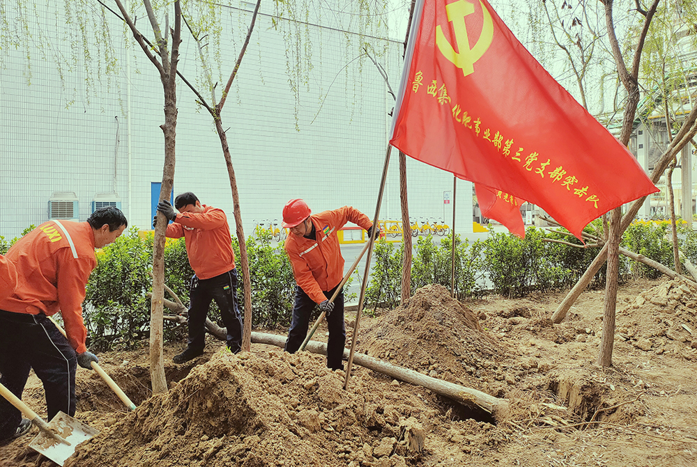 化肥事业部第三党支部协同化肥团支部全体党员、团员,共同开展“每人一棵树,建美丽园区”特色活动。广大党员干部积极发挥引领示范作用,与广大团员群众一起对园区进行绿化植树,1万余棵国槐、白蜡苗木被栽种到园区各个绿化带,它们迎风挺立、排列整齐,展现出勃勃生机。