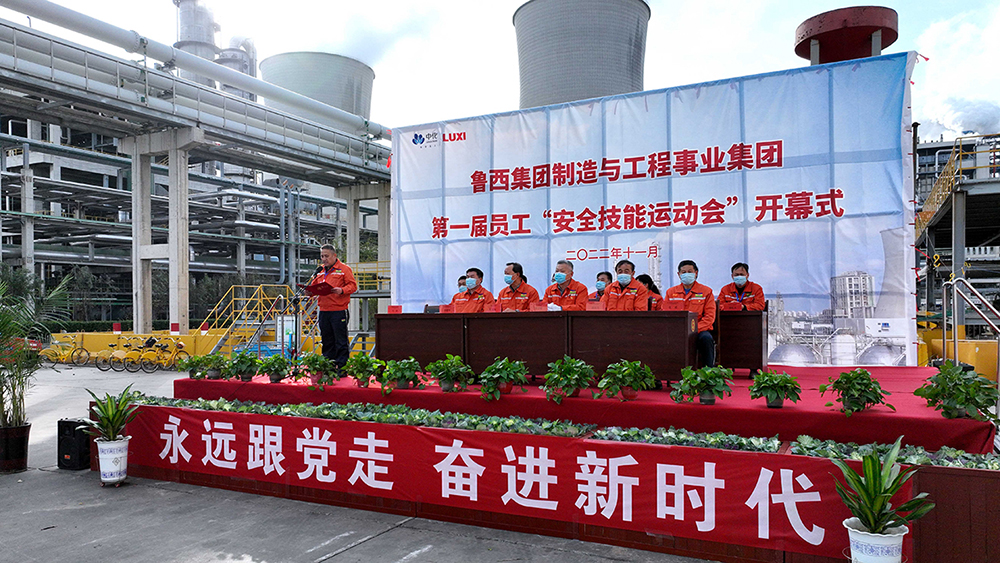 制造与工程事业集团第一届员工“安全技能运动会”隆重开幕。仪式开始,伴随着激昂奋进的运动员进行曲,仪仗队队员护卫运动会会旗迈着坚定有力的步伐率先入场,经过主席台接受检阅,紧接着由裁判员、各单位运动员组成的10支代表队,踏着音乐的旋律,迈着整齐的步伐,喊着响亮的口号,依次进入场地。运动会组委会负责人为大赛致开幕词,预祝本次运动会顺利召开;随后,裁判员、运动员代表分别上台宣誓。开幕式结束后,在雄壮的国歌声中,各参赛选手进入比赛场地开始竞赛。