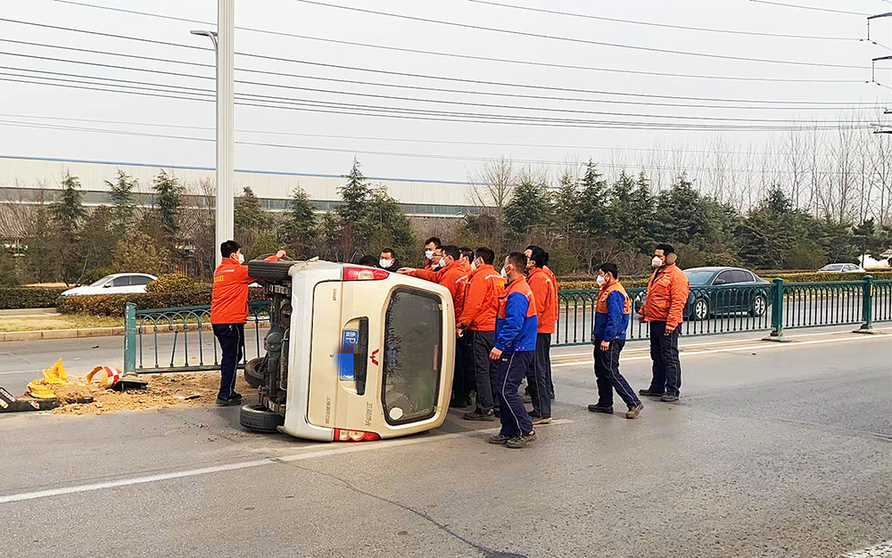 下属单位第七工程事业部门口就发生一桩惊悚而又让人感动的事件。此时临近中午,正值员工就餐时间,只听“咣”的一声巨响,一辆面包车疾驰撞向了道路隔离墩,车辆瞬间发生侧翻。此时门卫执勤人员魏庆阔发现情况后,第一时间召集了准备就餐的干部、员工十余人赶赴车祸现场,迅速打开主驾驶车门,此时司机因受到惊吓还未缓过神来,身体被安全带和车座卡住,前来营救的员工协助司机解除障碍,并确认司机意识和身体状况后,及时将司机从侧翻车辆内救出。此时正值中午下班高峰期,如果当时不能及时将司机救出,一旦发生其他车辆追尾,将酿成更加严重的后果。事后司机对公司见义勇为的行为既感动又感谢,并向参与救援的鲁西员工深深地鞠躬致谢。