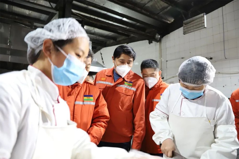 在第三职工餐厅,王延吉向一年来辛苦付出,为整个园区后勤保障工作提供周到服务的餐厅人员拜年,并询问了解了改造后的餐厅运行、人员就餐变化情况,同时现场查看了年夜饭准备、春节期间员工用餐保障、先进设备使用、消毒间高温消毒情况等。叮嘱膳食处负责人做好消毒间、消毒环节的安全管理工作,结合本次疫情带给我们的提醒,科学考虑餐厅周边布置,严格管控购进食材的验收、检测、储存等环节,确保员工就餐安全。
