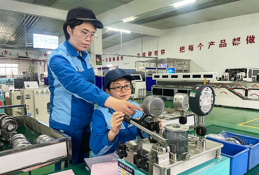 干一行、爱一行、专一行、精一行。从压力表组装、变送器校验,到膜片焊接、法兰变送器注油……她不但能够熟练掌握每一道工序的操作,还善于发现和解决影响产品制作的各种生产瓶颈。压力表、变送器的制作工序繁琐复杂,工作流程稍微有停滞,就会影响整个工序的运行。随着产品类型的增多,打压工序原有的打压工装已不能完全满足各种法兰的打压需求,尤其是特殊工艺要求的法兰工装。为解决这一难题,张凤娟白天向机加工师傅学习取经,晚上自学CAD制图,从一个简单的法兰孔画起,直到一套完整的打压工装设计制作完成,在她不懈的努力下,打压工作效率由每天10台提高到30台。