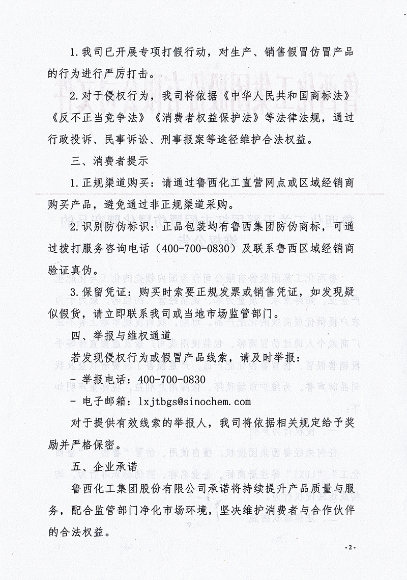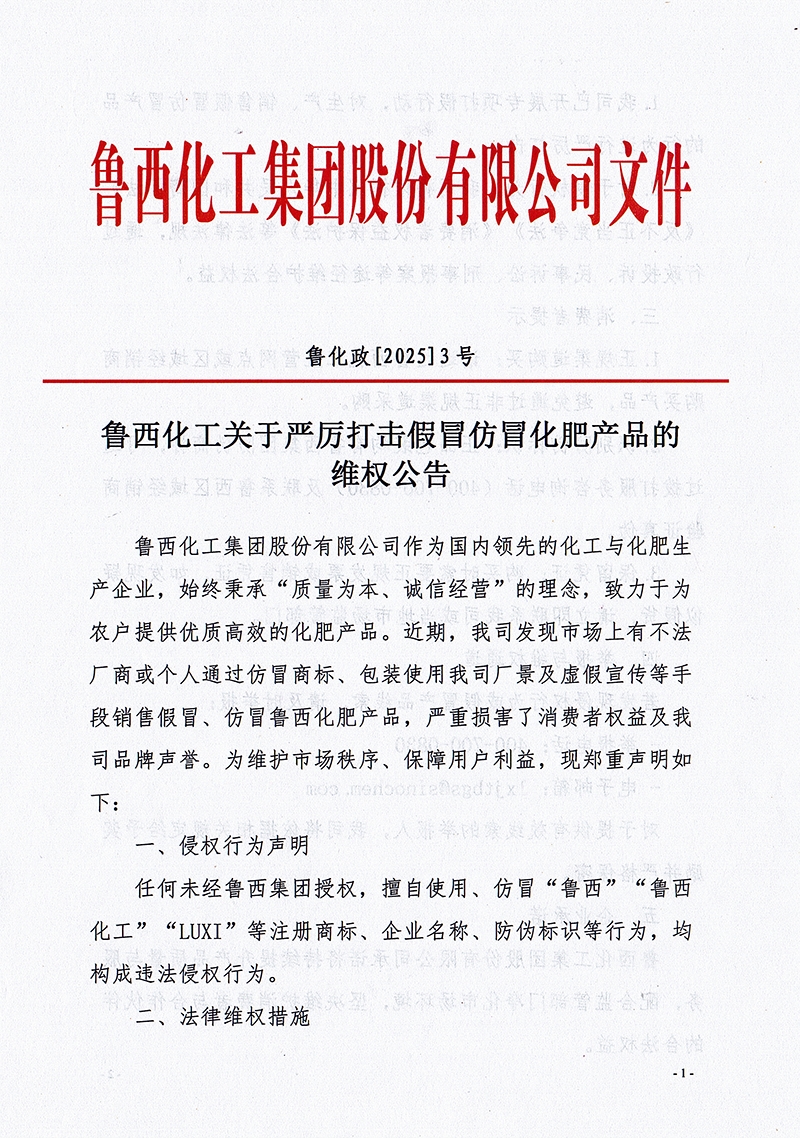 鲁西化工关于严厉打击假冒仿冒化肥产品的维权公告